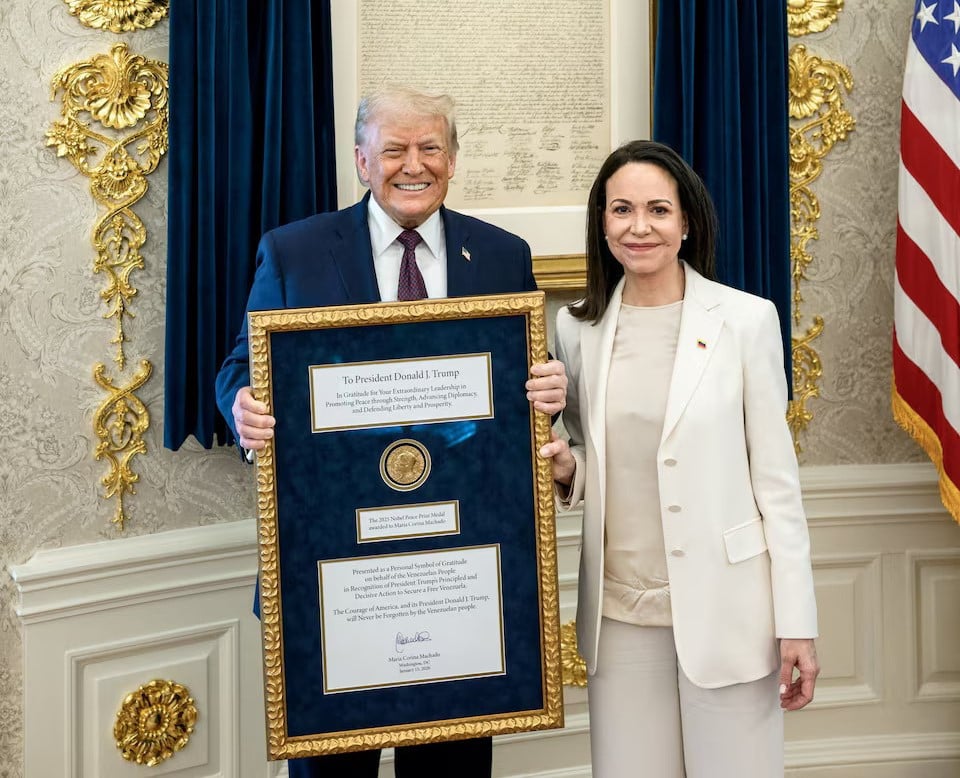 (2026-01-16). Trump welcomes Venezuela's Maria Corina Machado in closed-door meeting. aljazeera.com The Venezuelan opposition leader said she presented Trump with her Nobel Peace Prize, an honour he has long coveted.